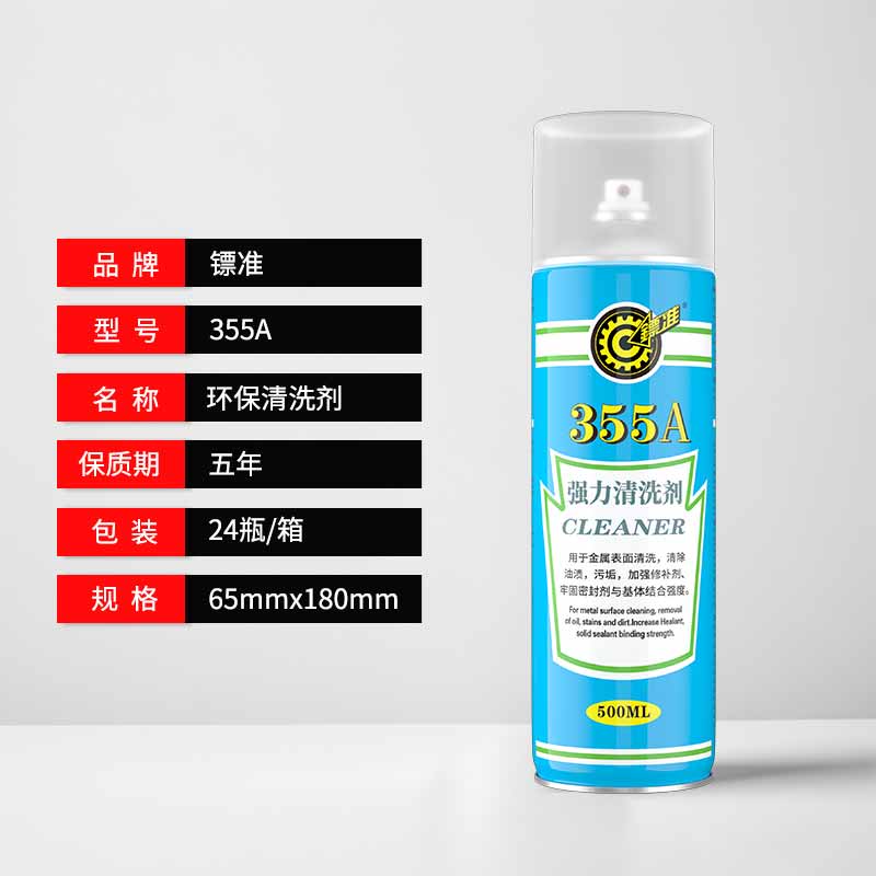 镖准 355A 强力清洗剂是由碳氢溶剂与其他有机溶剂及表面活性剂复配而成,清洗能力强,挥发速度适中,与金属材料及大部分非金属材料兼容。