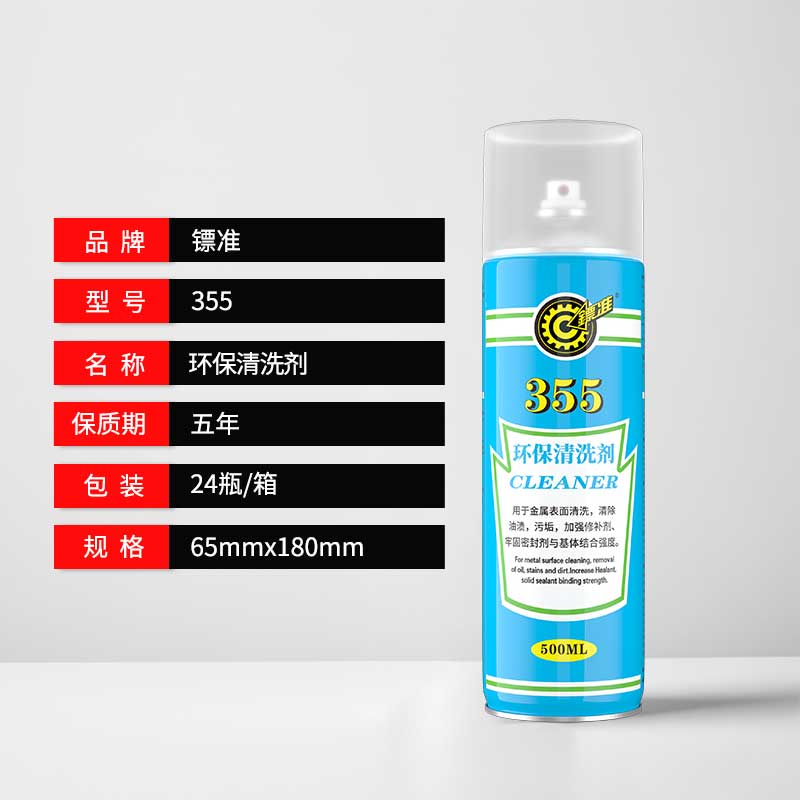 镖准 355 – 环保清洗剂是由精制碳氢溶剂及表面活性剂复配而成,清洗能力强,挥发速度快,与金属材料及大部分非金属材料兼容。
